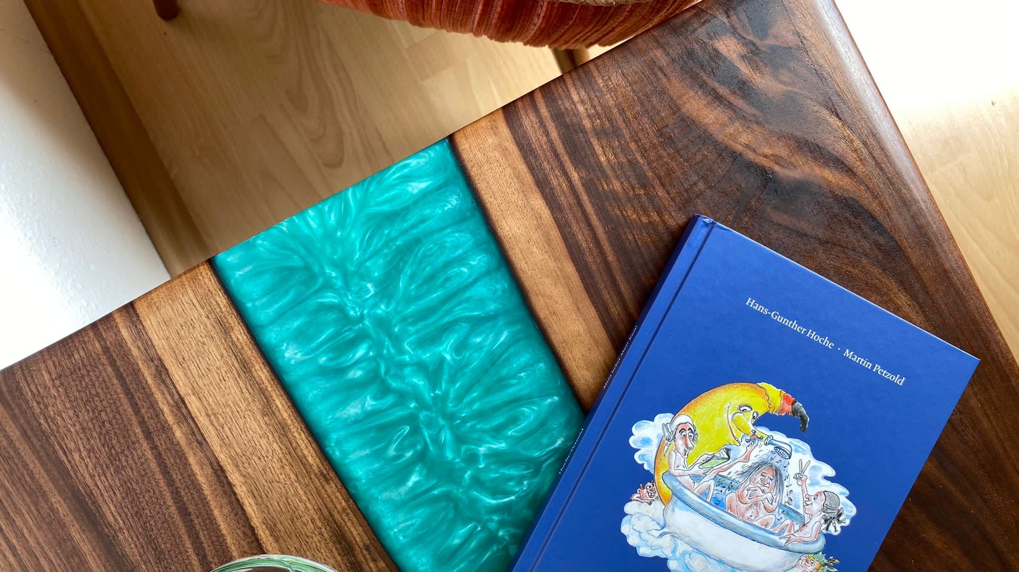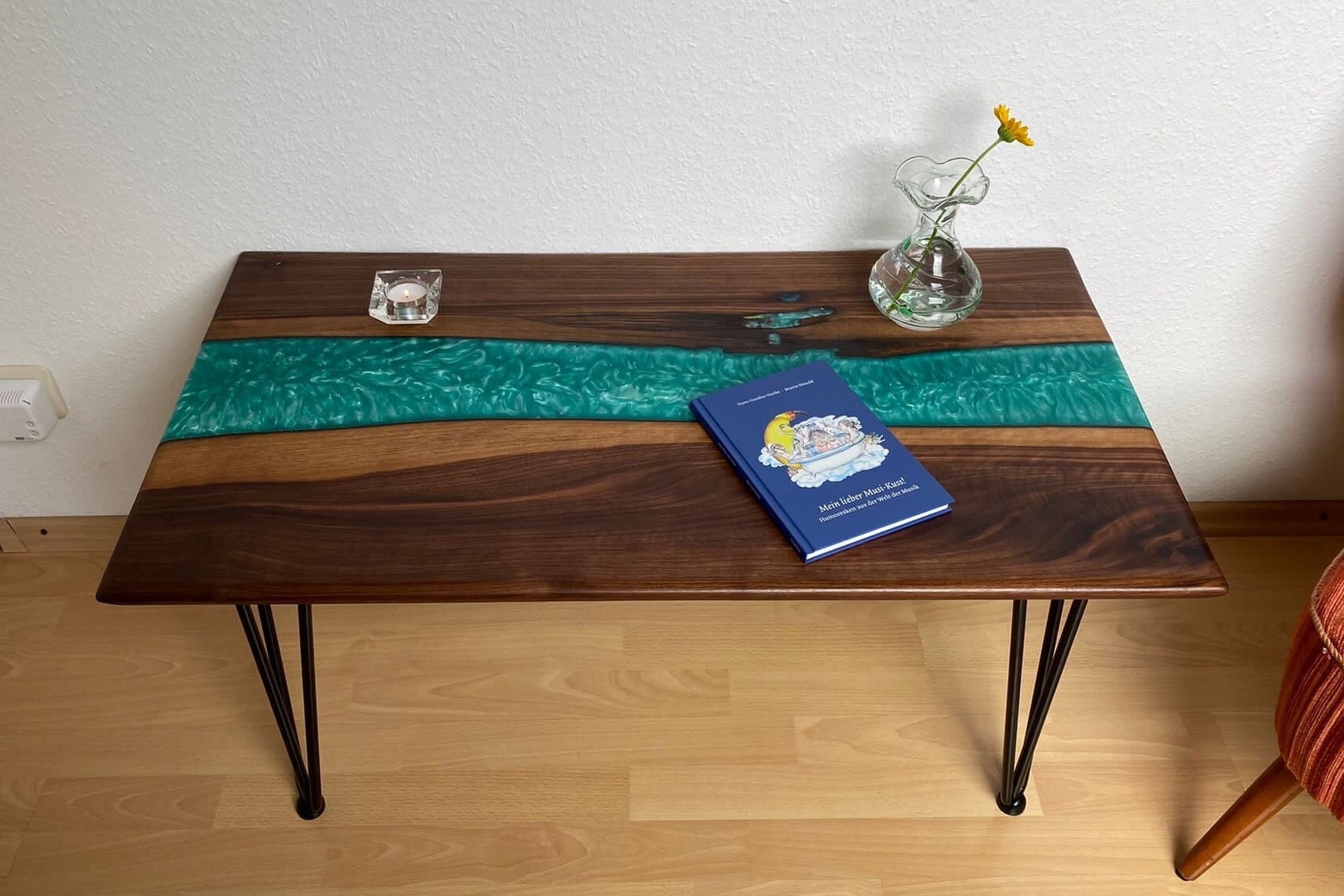 The rectangular American walnut table features a diamond-shaped centerpiece made of epoxy resin (Dipoxy). The three-legged hairpin legs made of black metal (STILISTA®) complete this handmade table. Enjoy this summer with this attractive coffee table for your drinks in the living room or your next party! It's guaranteed to be an eye-catcher in your home!