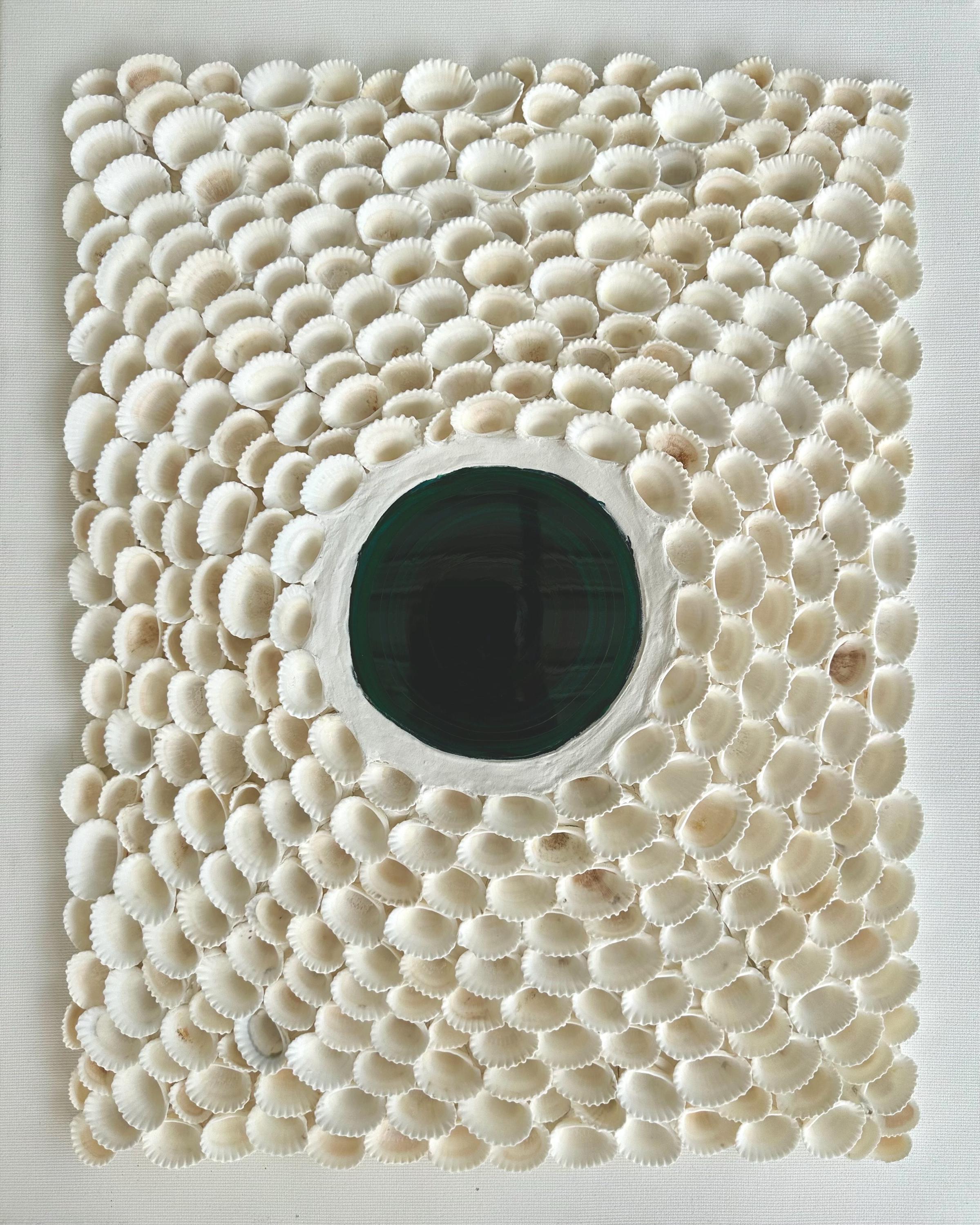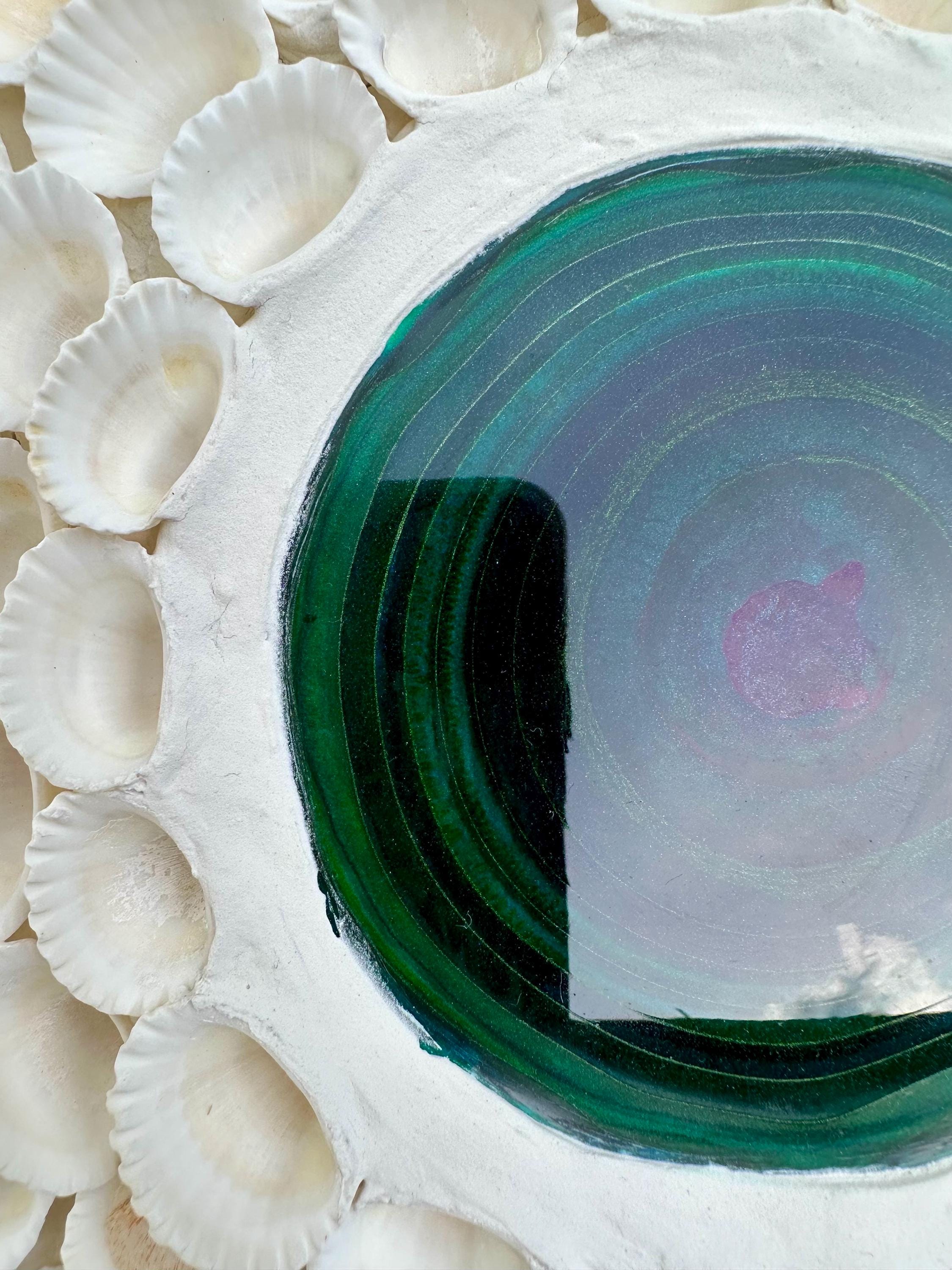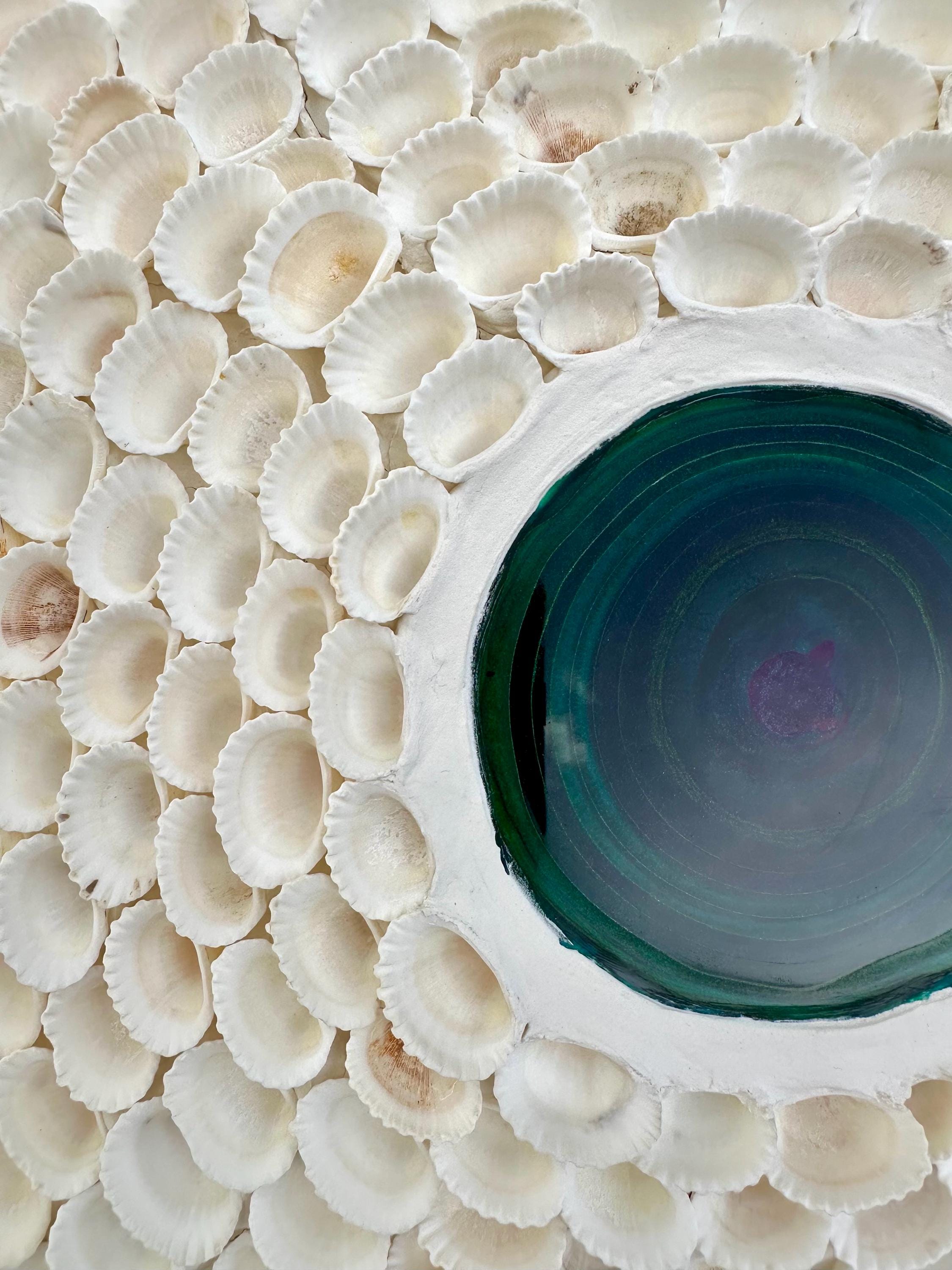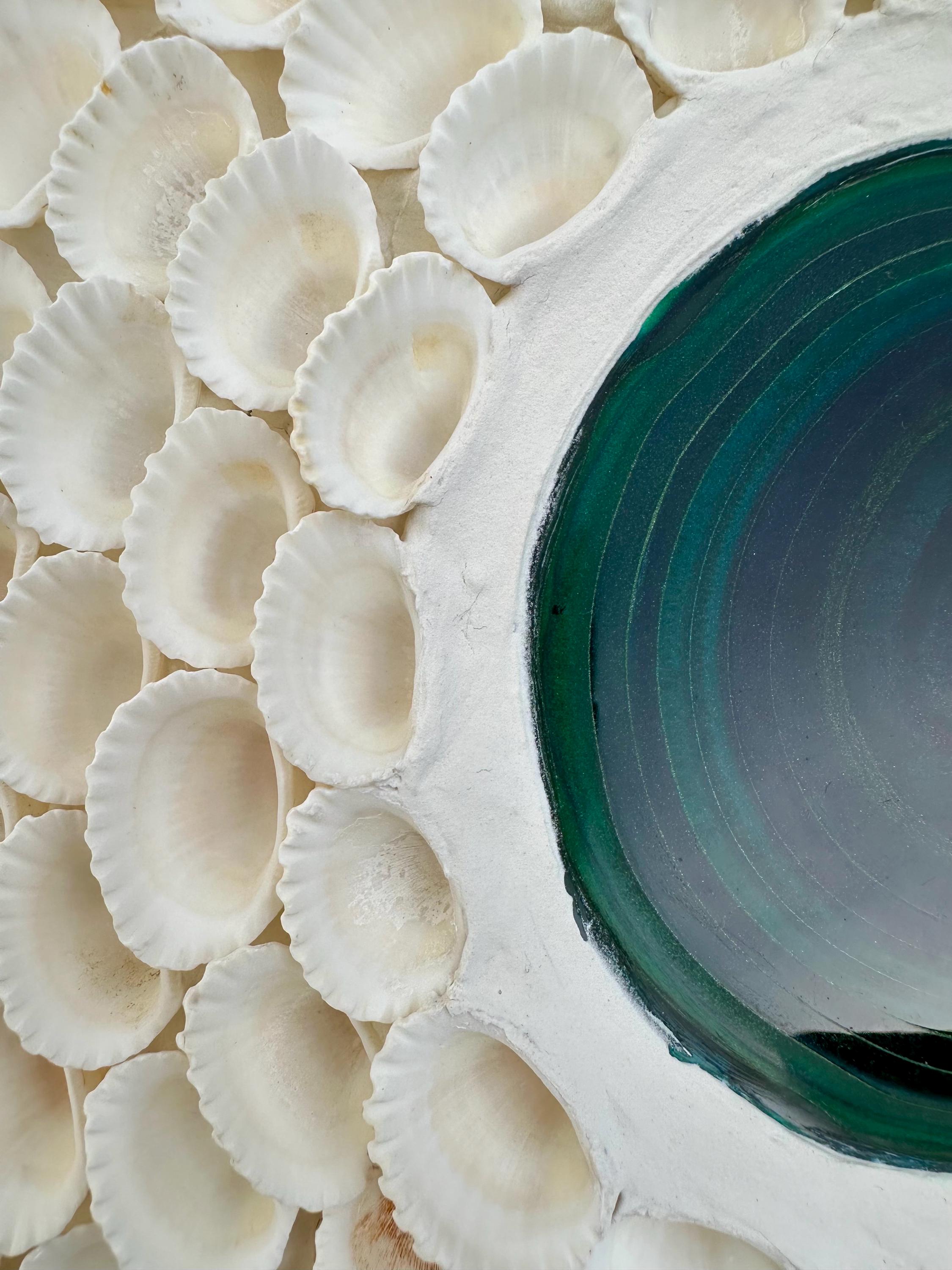 This canvas, created with filler, shells (Amazon), and epoxy resin, embodies the seaside feeling of the beach. The bird's-eye view reveals the many shells and takes you on a dreamy tropical journey. Picture "Beach Spirit"